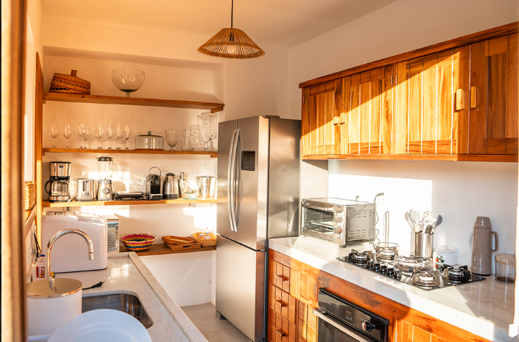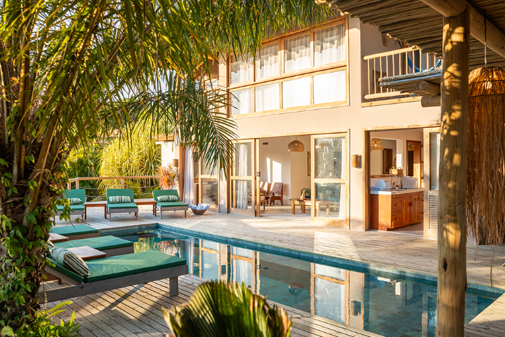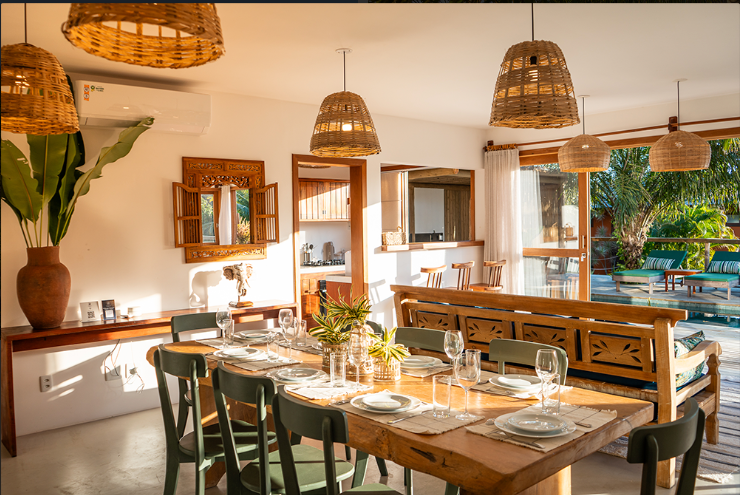 Um convite para uma experiência única em um ambiente projetado, com decoração clean, arte selecionada e vista da mata com pôr do sol.