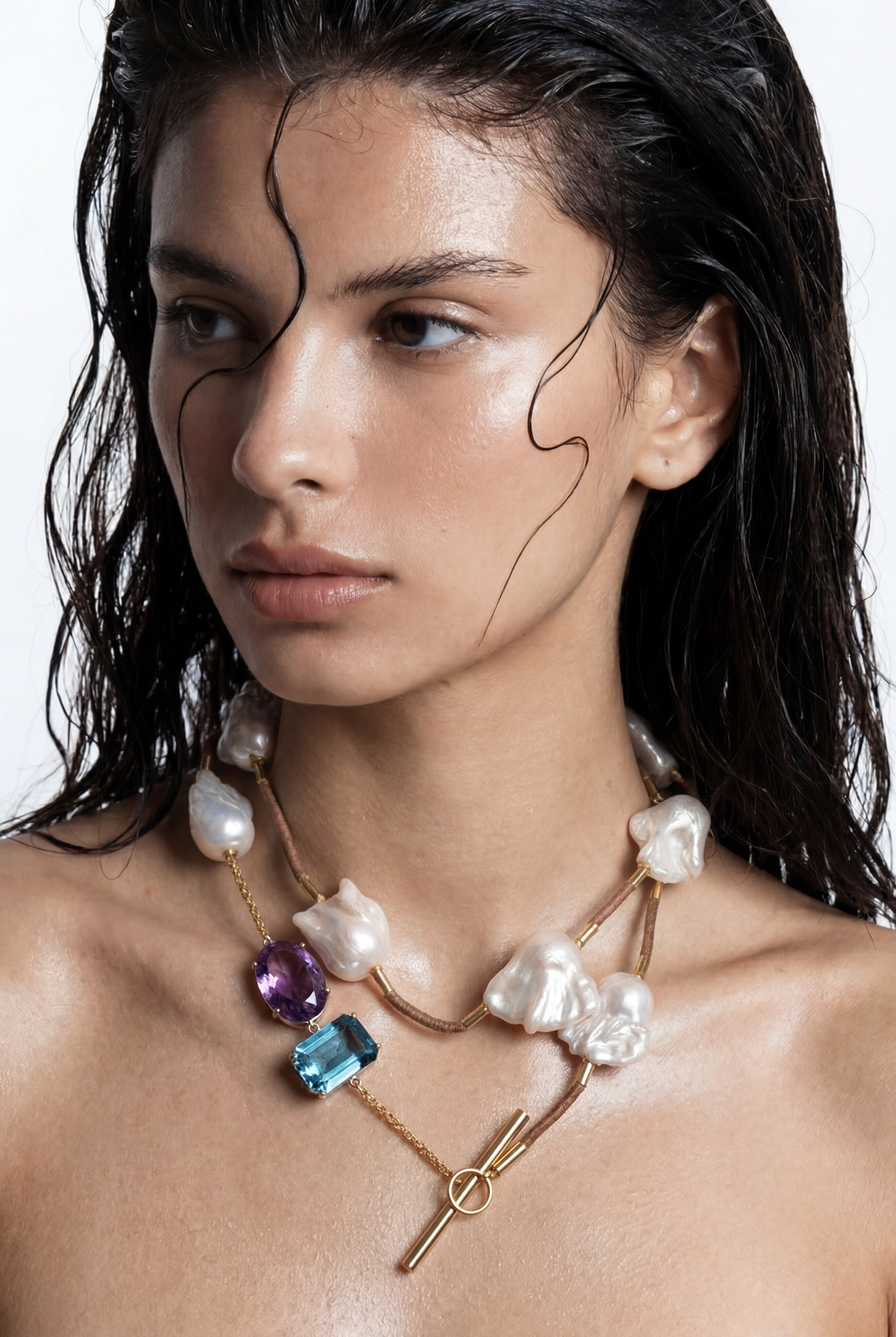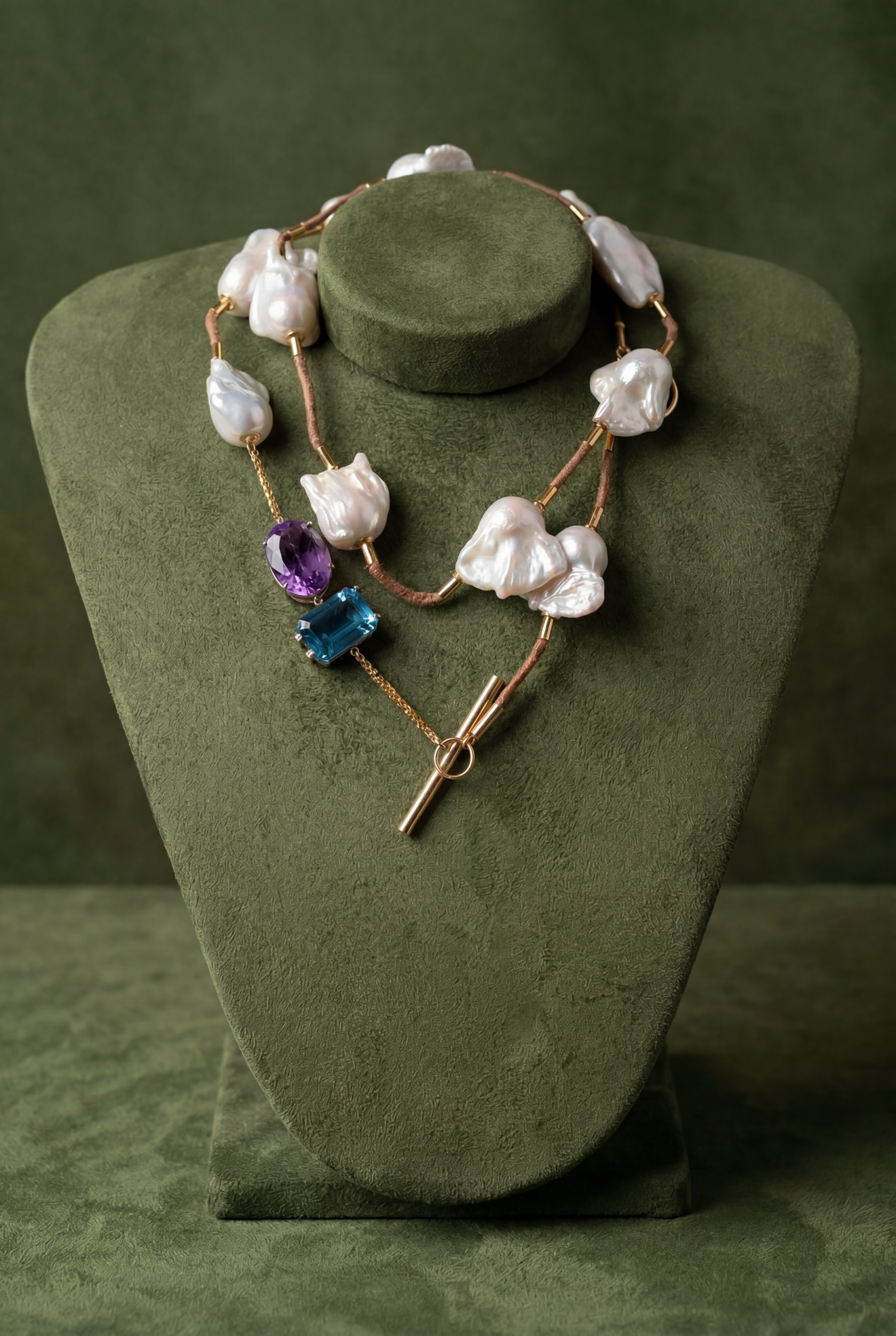 Colar em ouro amarelo 18K, couro, Pérolas barrocas irregulares (50 ct), Green Gold (17,86 ct), Ametista (15,07ct)